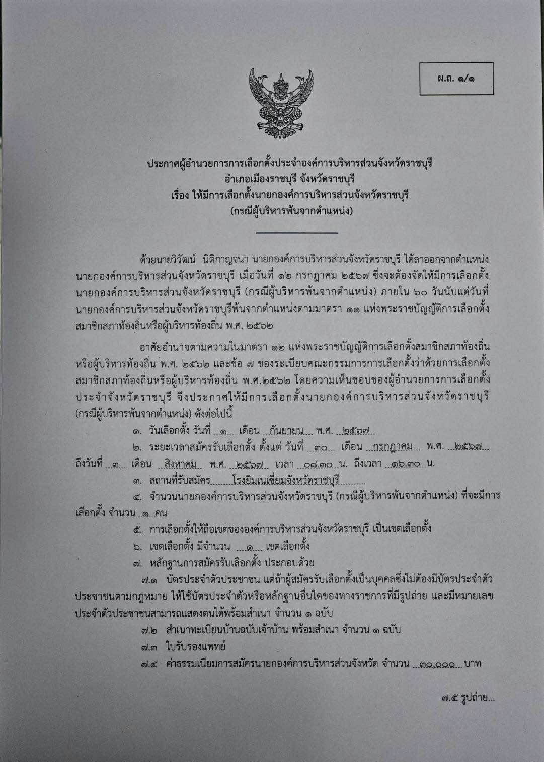 ประกาศ เรื่อง ให้มีการเลือกตั้งนายกองค์การบริหารส่วนจังหวัดราชบุรี ...