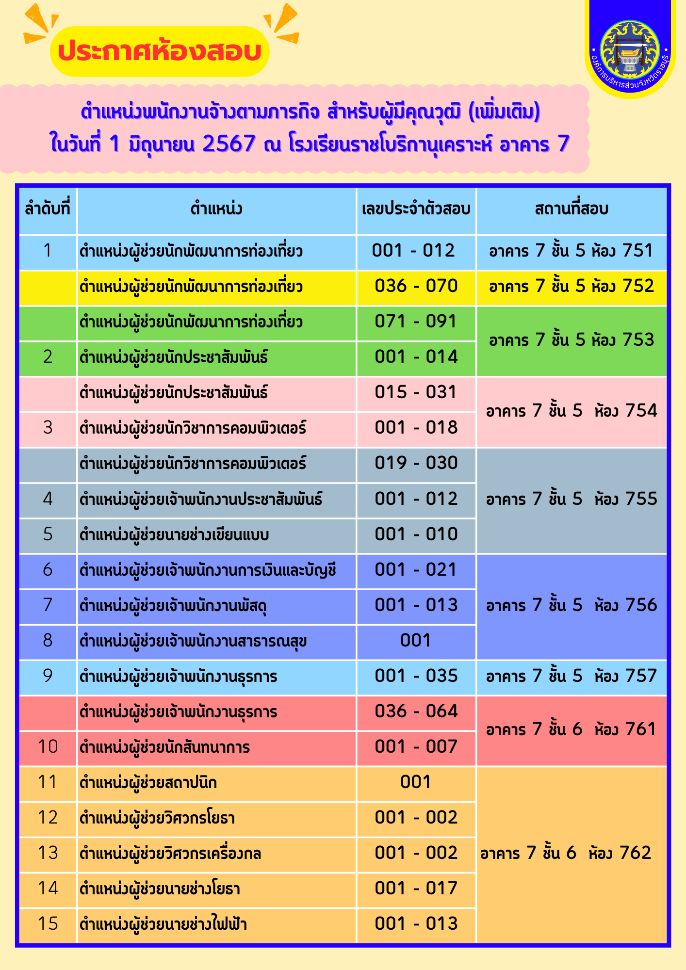 ประกาศห้องสอบ ตำแหน่งพนักงานจ้างตามภารกิจ สำหรับผู้มีคุณวุฒิ (เพิ่มเติม) ...