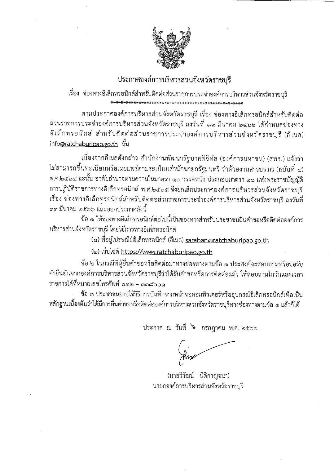 ประกาศองค์การบริหารส่วนจังหวัดราชบุรี เรื่อง ช่องทางอิเล็กทรอนิกส์สำหรับติดต่อส่วนราชการประจำองค์การบริหารส่วนจังหวัดราชบุรี