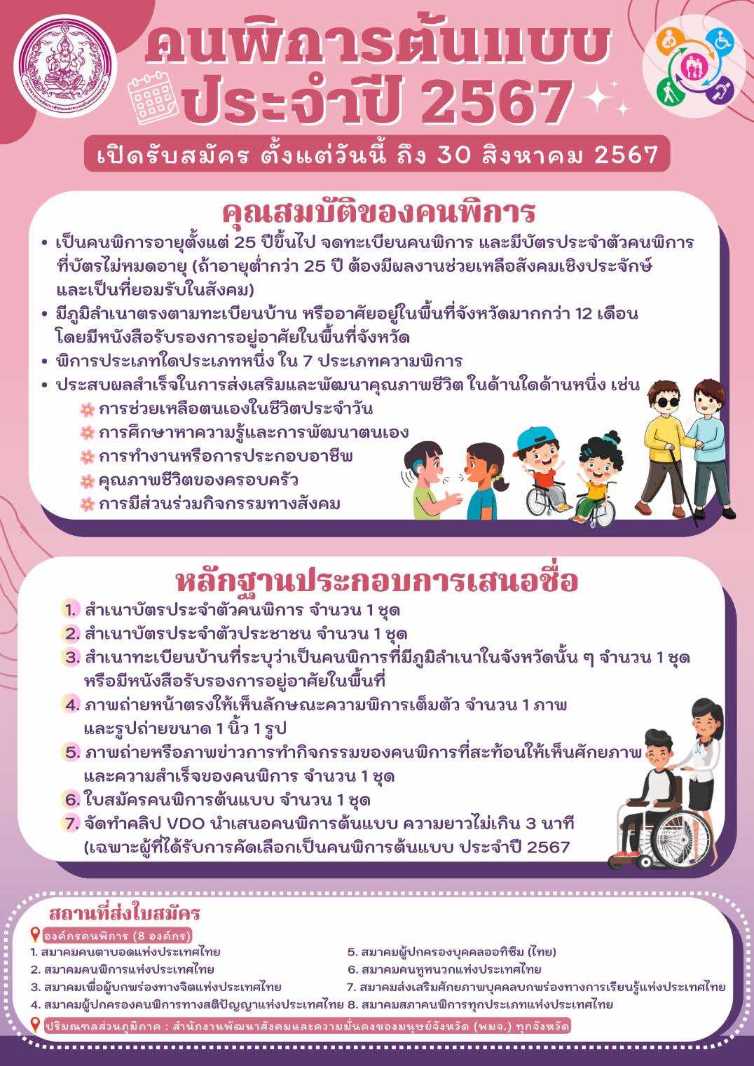 เปิดรับสมัคร คนพิการต้นแบบ ประจำปี 2567 ตั้งแต่วันนี้ ถึง 30 สิงหาคม 2567 ...